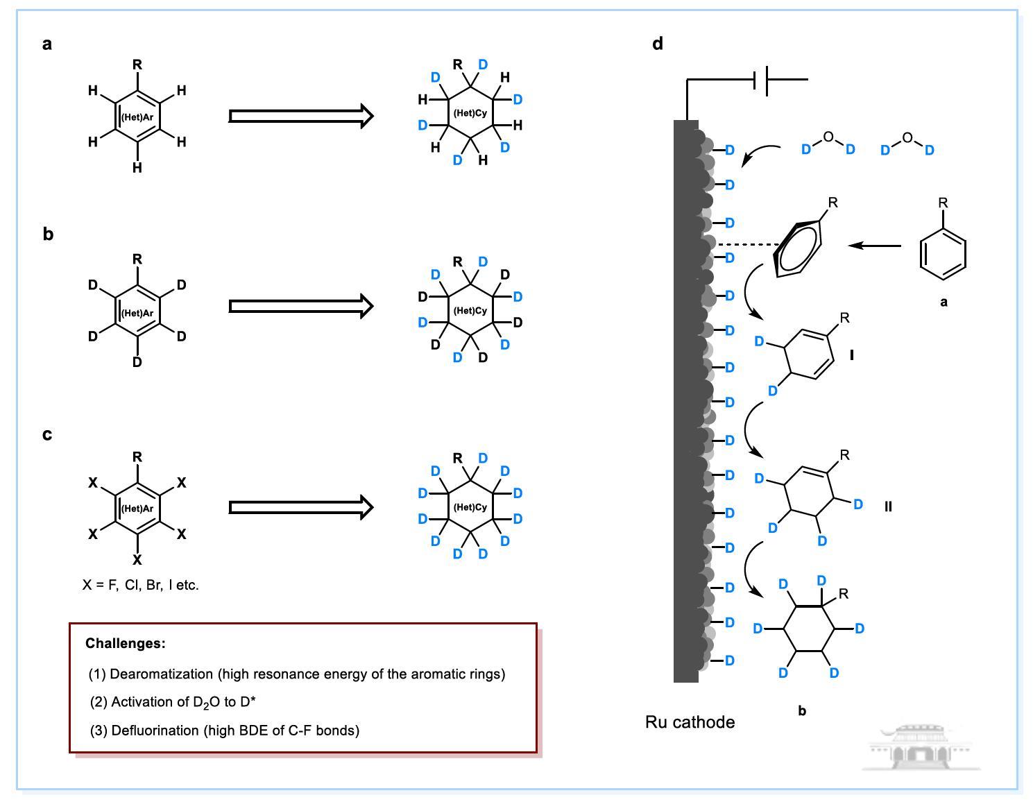 氘标记被广泛应用于新药创制、质谱内标、化学反应动力学、生物示踪剂等研究。例如,氘代新药氘代丁苯那嗪(安泰坦)、多纳非尼(泽普生)、VV116(民得维)等已获批上市。此外,核磁共振氘代谢成像作为新兴起的分子代谢成像技术被广泛关注。然而,目前已开发的氘标记方法十分有限,并且已开发的方法在引入多个氘原子和高氘标记率方面存在极大的挑战。这些因素造成了氘标记化合物的价格十分高昂。开发使用廉价氘源的高效氘标记方法具有重要意义。饱和(杂)环状结构广泛存在于药物和天然分子中,以廉价易得的芳烃化合物为原料合成氘标记饱和(杂)环状化合物是一种经济且高效的合成方法。到目前为止,具有普适性的芳烃还原氘标记的方法还未曾被开发出来。